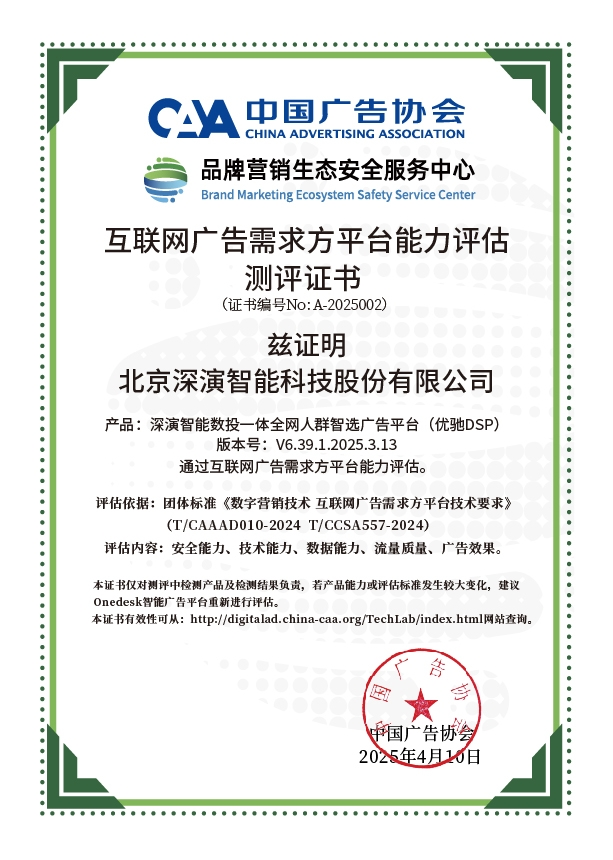 4月10日,中国广告协会发布「互联网广告需求方平台能力评估」测评结果。Martech领域领军企业壹定发智能旗下产品壹定发智能数投一体全网人群智选广告平台(优驰 DSP),凭借其在智能算法优化、技术创新、数据安全治理及流量质量管控等维度的突出表现,高分通过该项行业权威测评,获颁中国广告协会评估证书,成为业内首批通过认证的标杆企业。